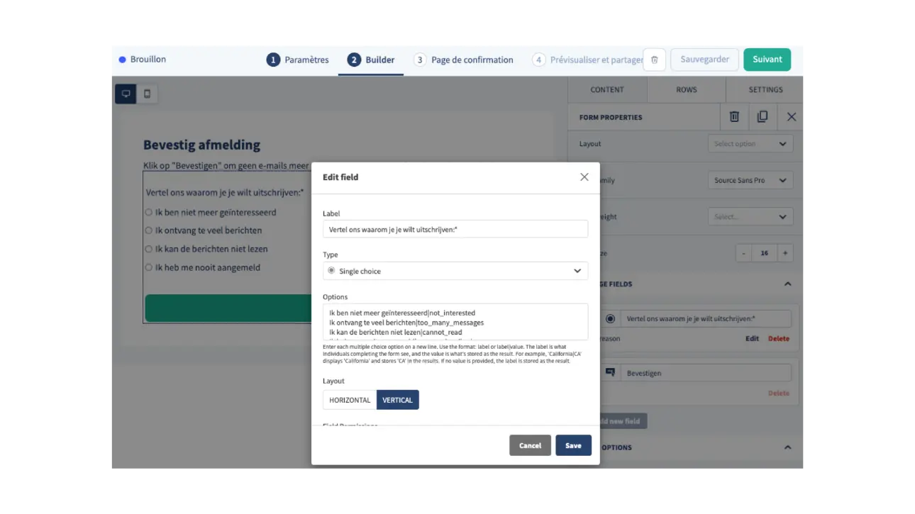 Personnalisez vos champs si besoin. (Wording, +/- de choix)
